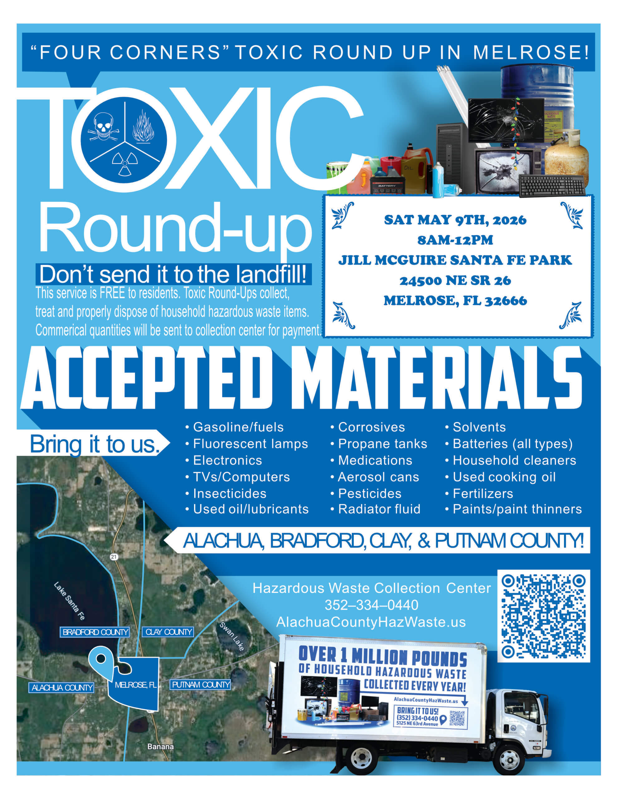 Putnam County residents are invited to a free Toxic Round-Up event on Saturday, May 9th, from 8:00 AM to 12:00 PM in Melrose.
